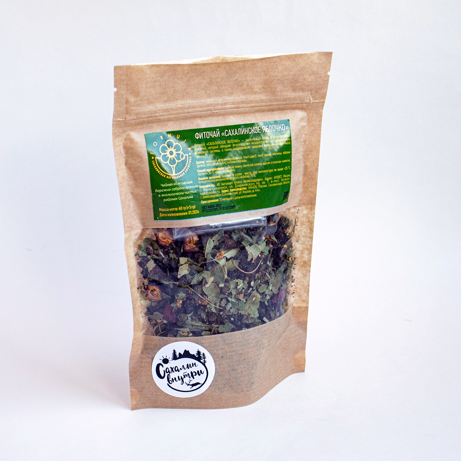 Фиточай «Сахалинское яблочко» — уникальный сбор из сахалинских растений, который обладает благотворным воздействием на кровеносную и нервную системы, а также поддерживает здоровье желудочно-кишечного тракта. Состав: иван-чай ферментированный, сахалинские яблоки, лист малины ферментированный, липа (цвет, лист), палочка корицы. Объём 50 гр. Чайная композиция бережно собрана вручную в экологически чистых районах Сахалина.