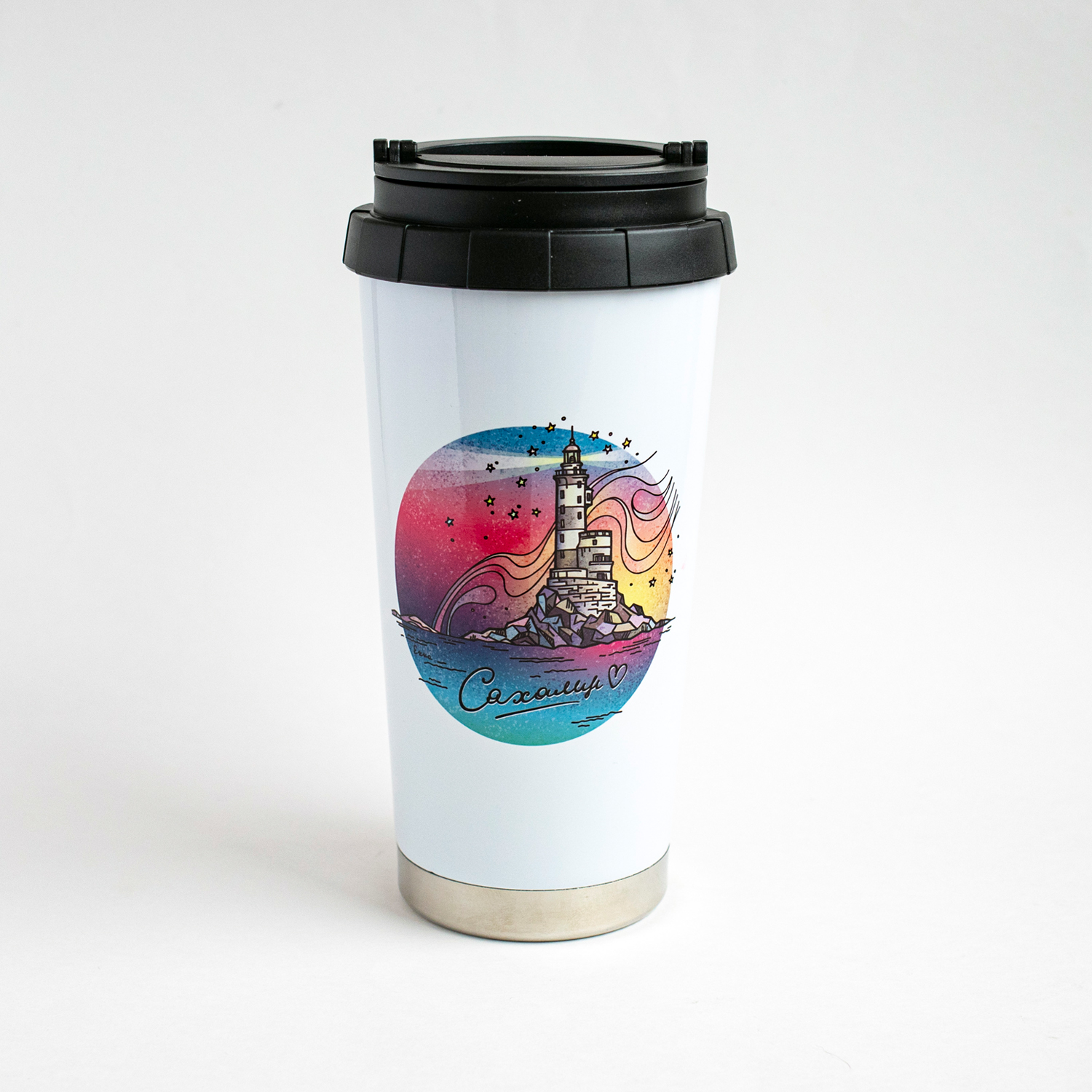 Металлическая термокружка с изображением маяка Анива. Сохраняет тепло до 4 часов. Объём 480 мл.