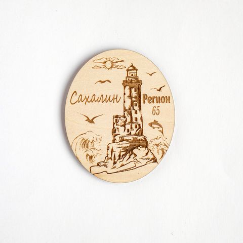 Деревянный магнит с изображением маяка Анива. Лазерная гравировка. Размер 6,5х8 см.