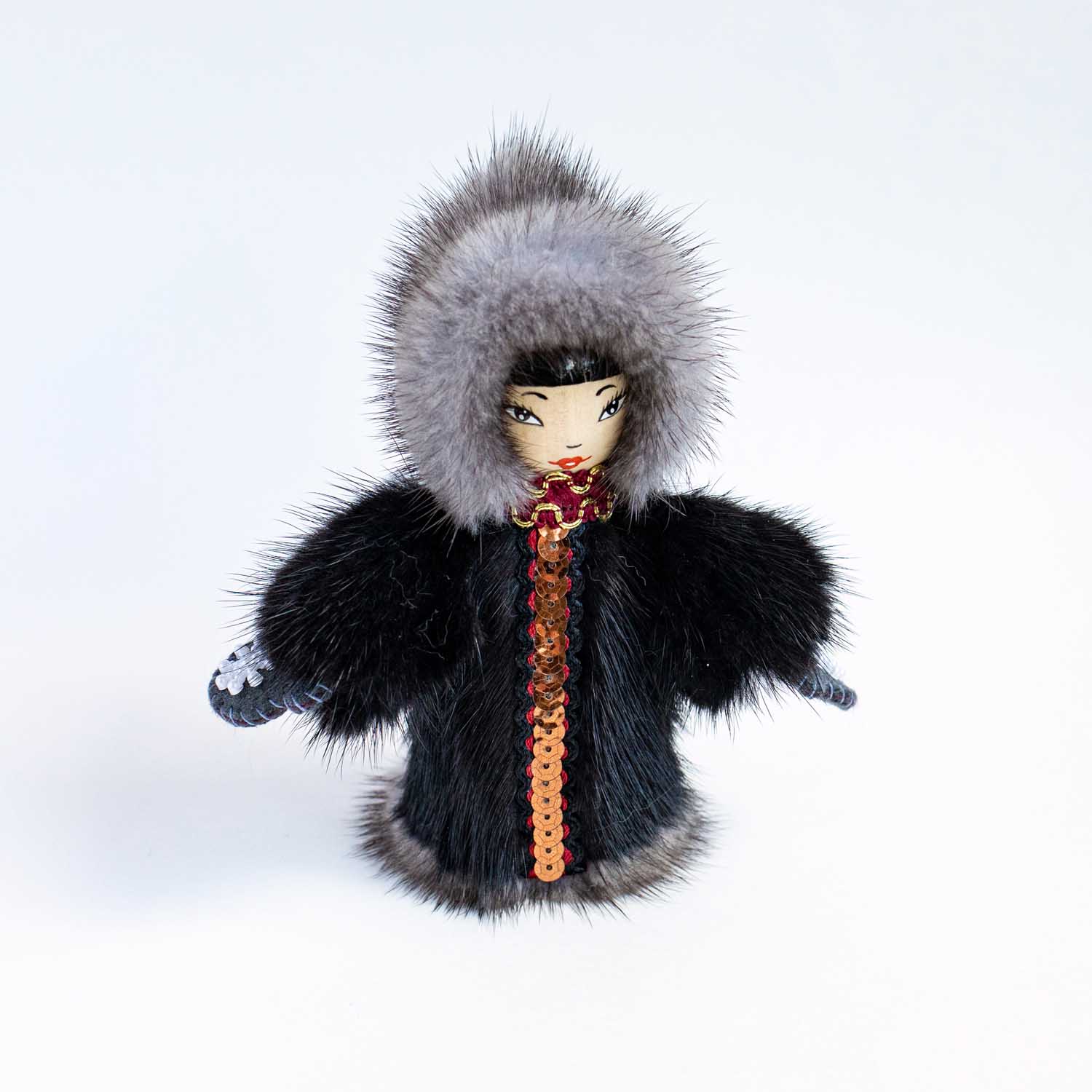 Декоративная кукла. Деревянная основа, натуральный мех, пайетки, бисер. Ручная работа. Сделано на Сахалине. Высота 14 см.