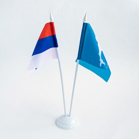 Флаг России и Сахалинской области на настольной подставке. Размер одного флажка 10х15 см. Высота подставки 30 см.